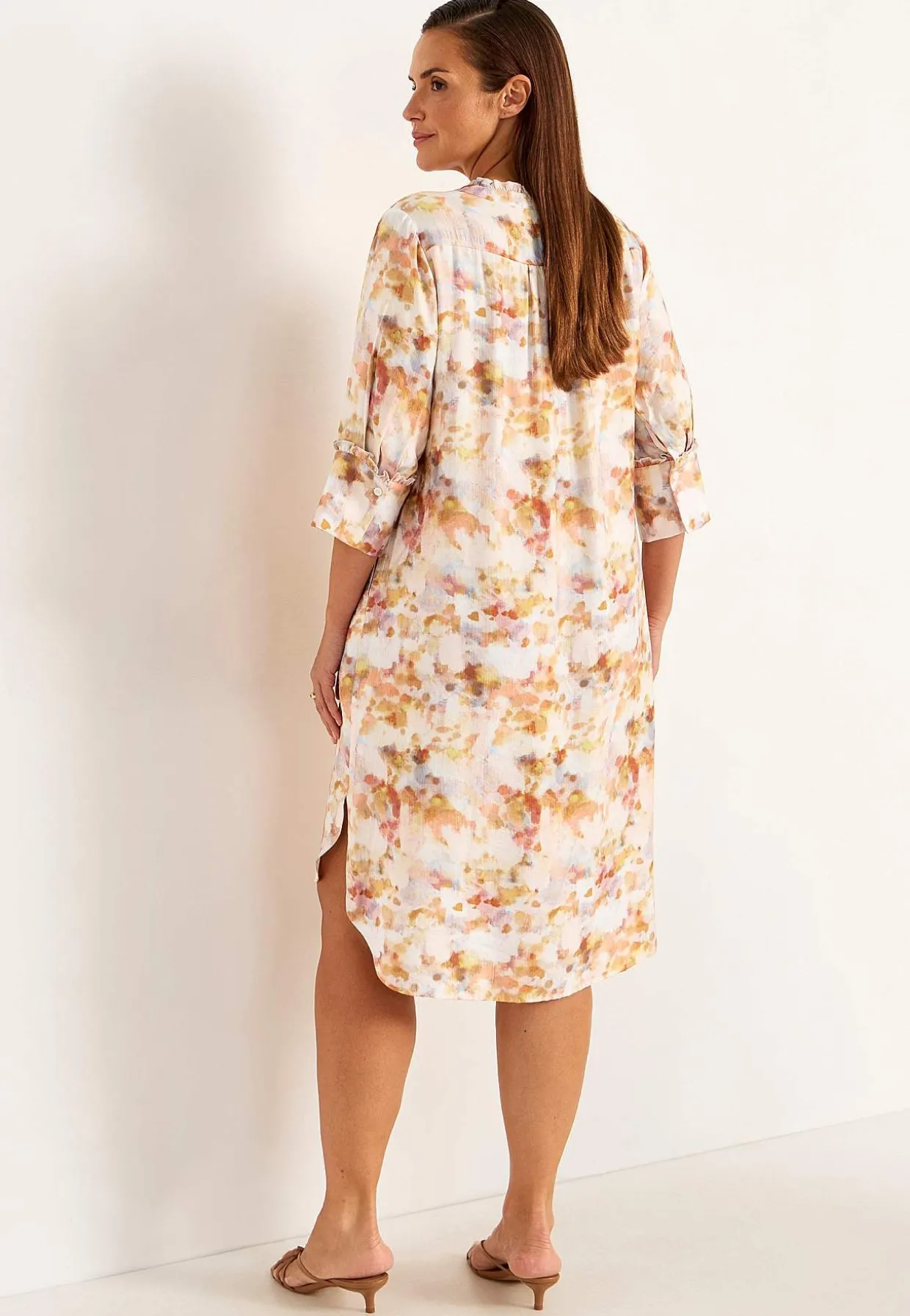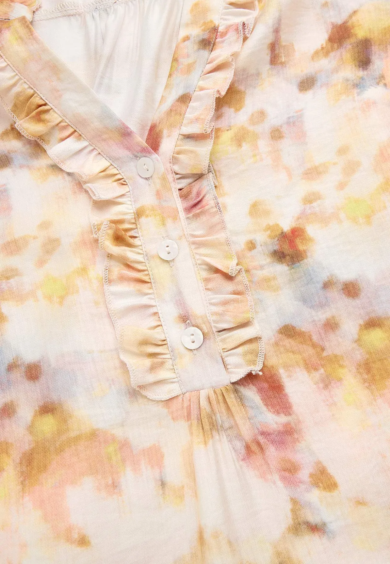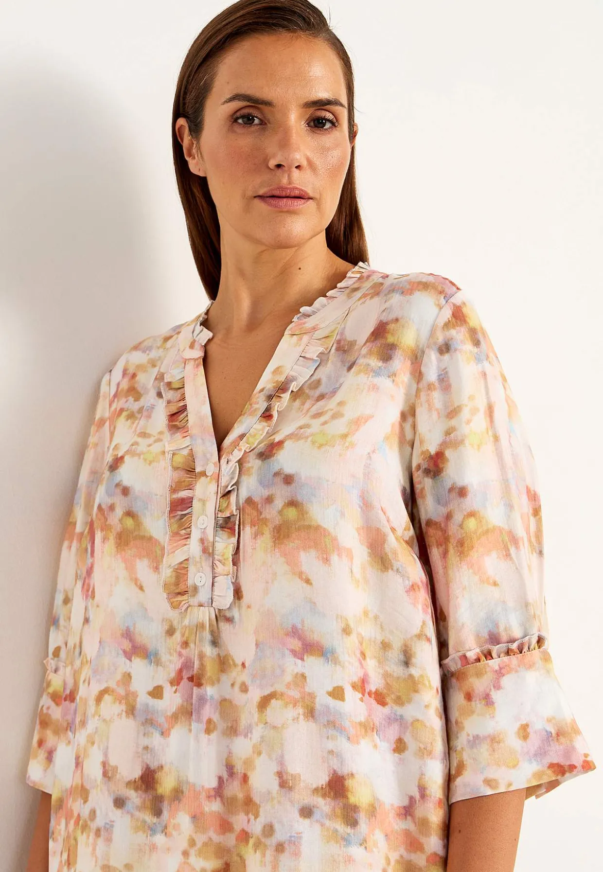 • Brede 3/4 ærmer med volant og bred manchet med knap.