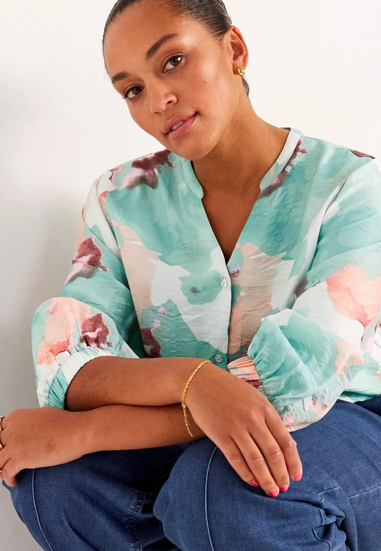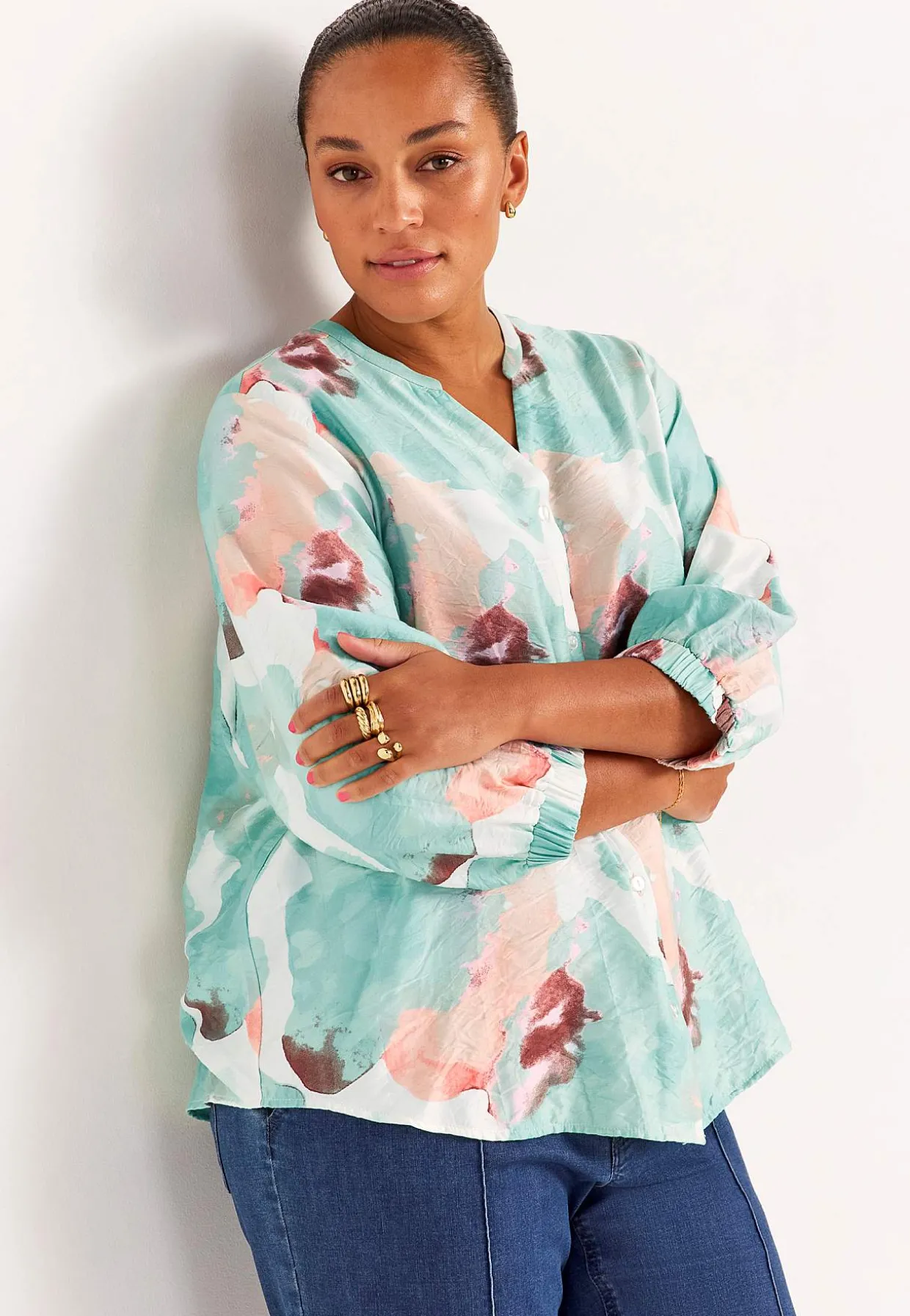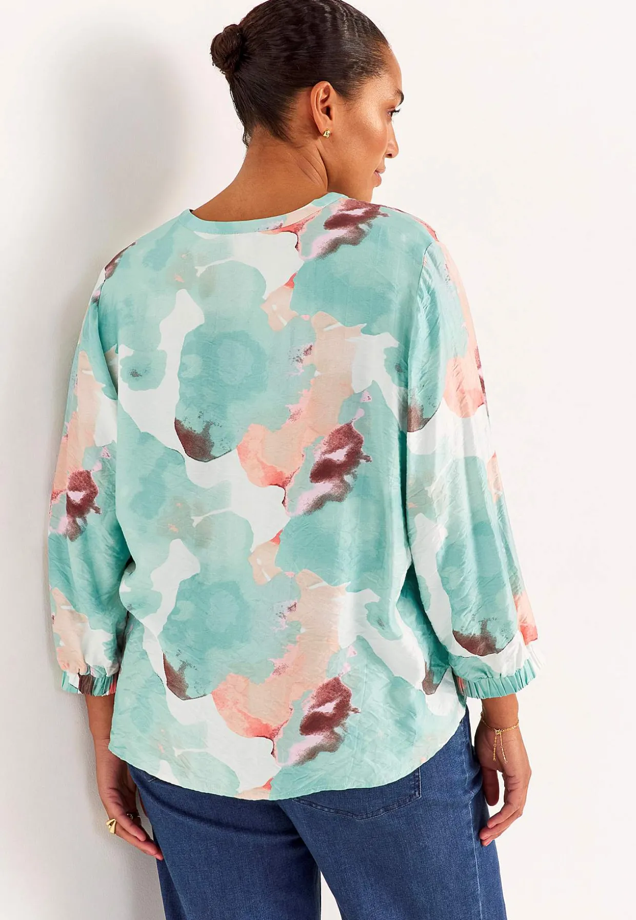 • 3/4 lange, brede ærmer med elastik ved manchetterne.