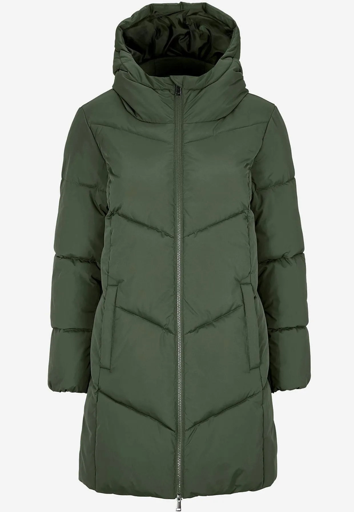 • Quiltet, fast hætte.