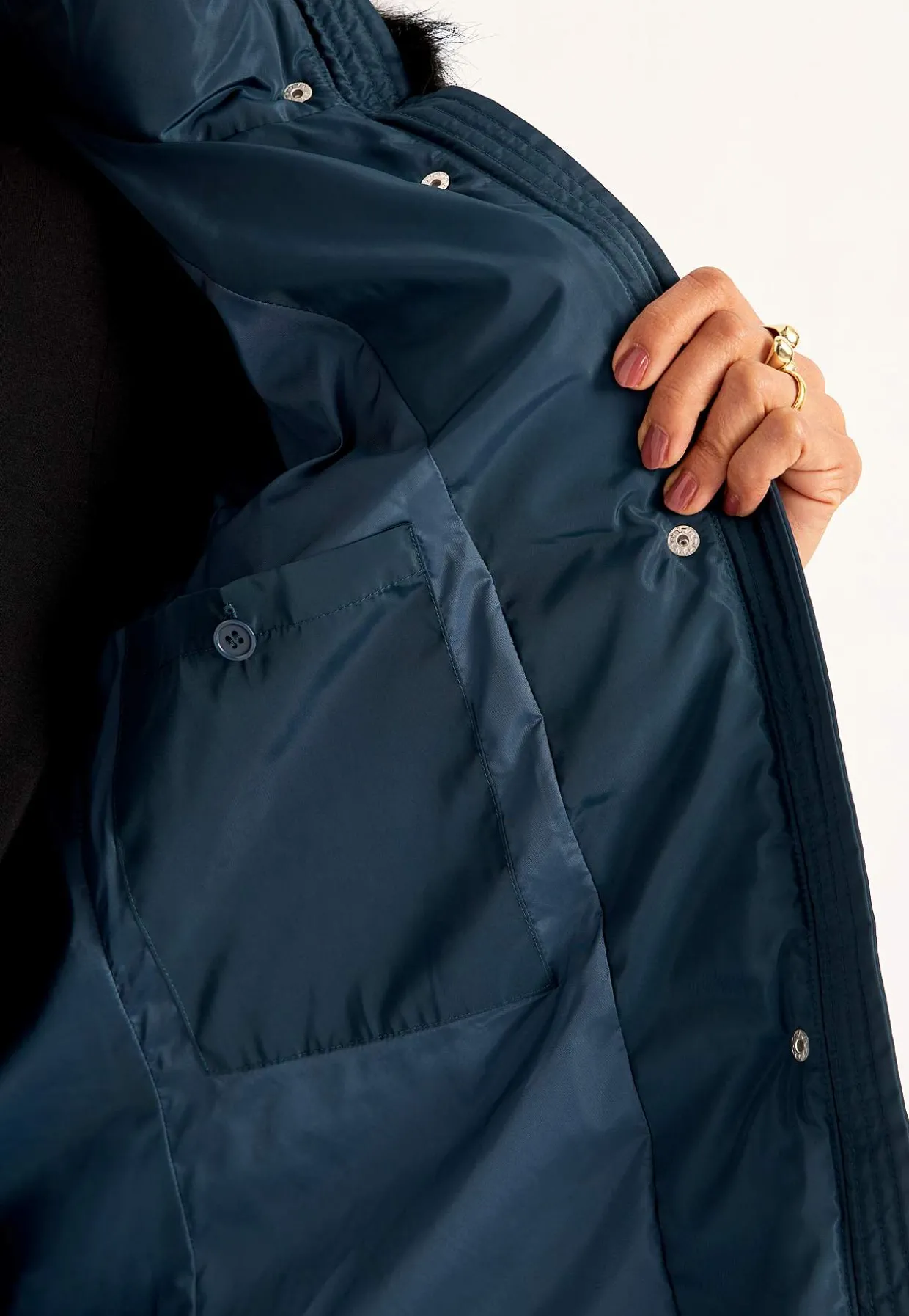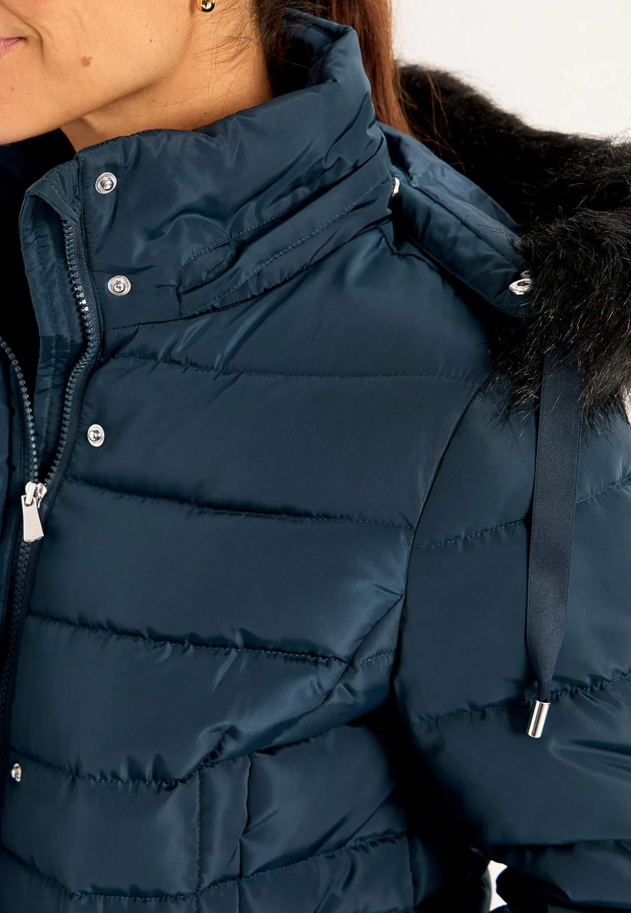 • Aftagelig hætte med aftagelig pelsimitation og snoretræk.