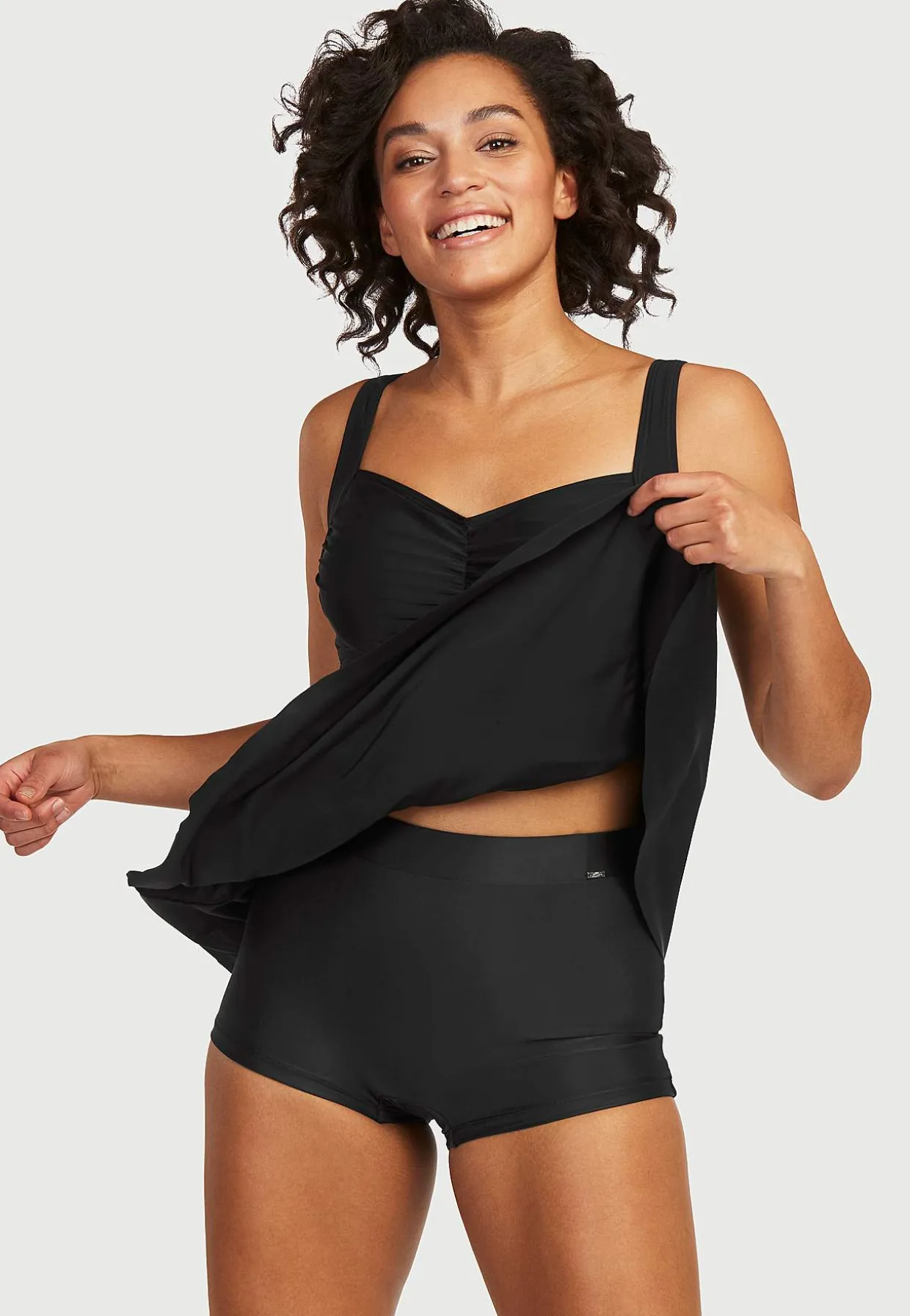 Stilfuld tankinitop med v-udskæring og volanter perfekt til stranden.
