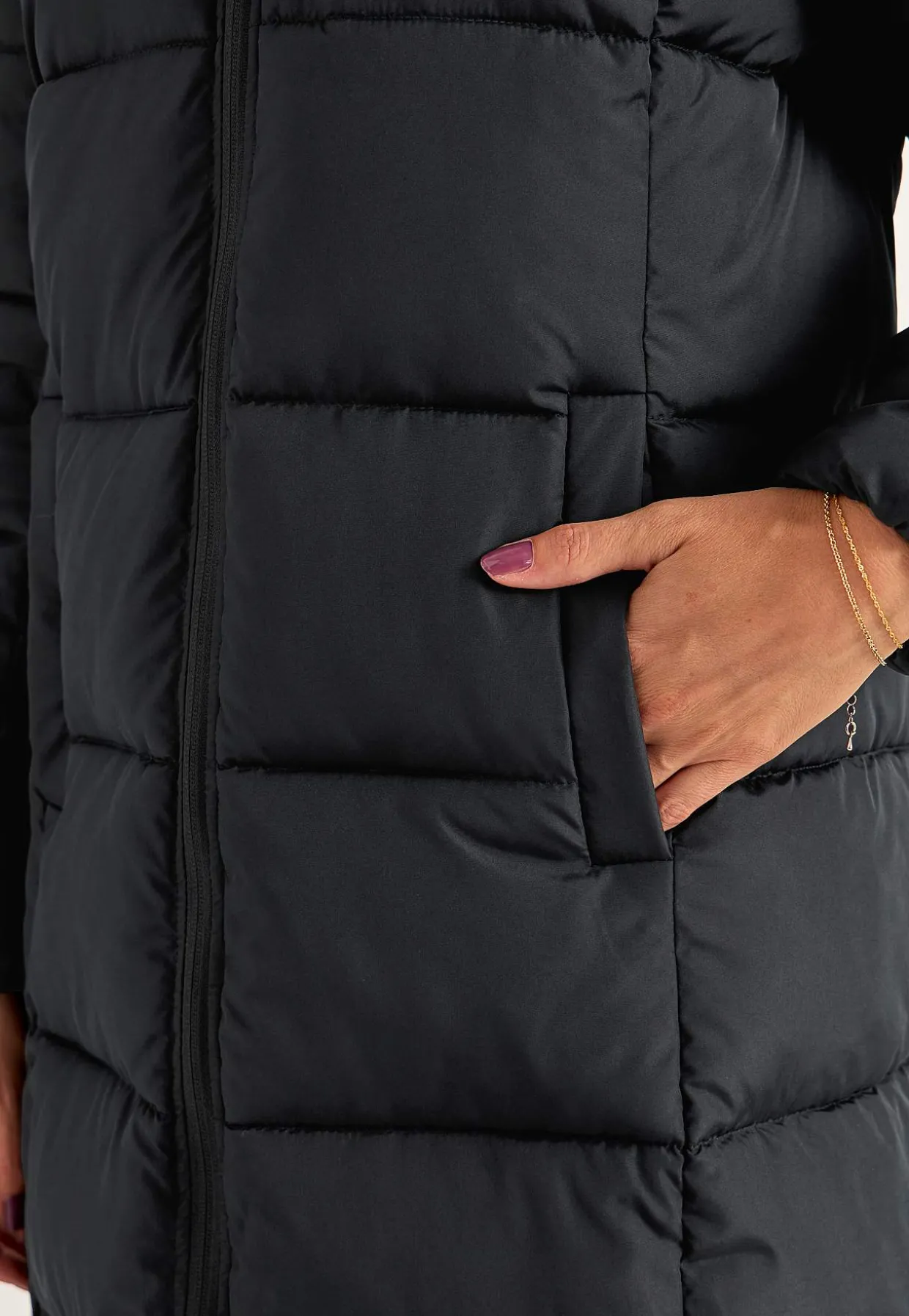 • Paspolerede lommer i siderne med skjult trykknap.